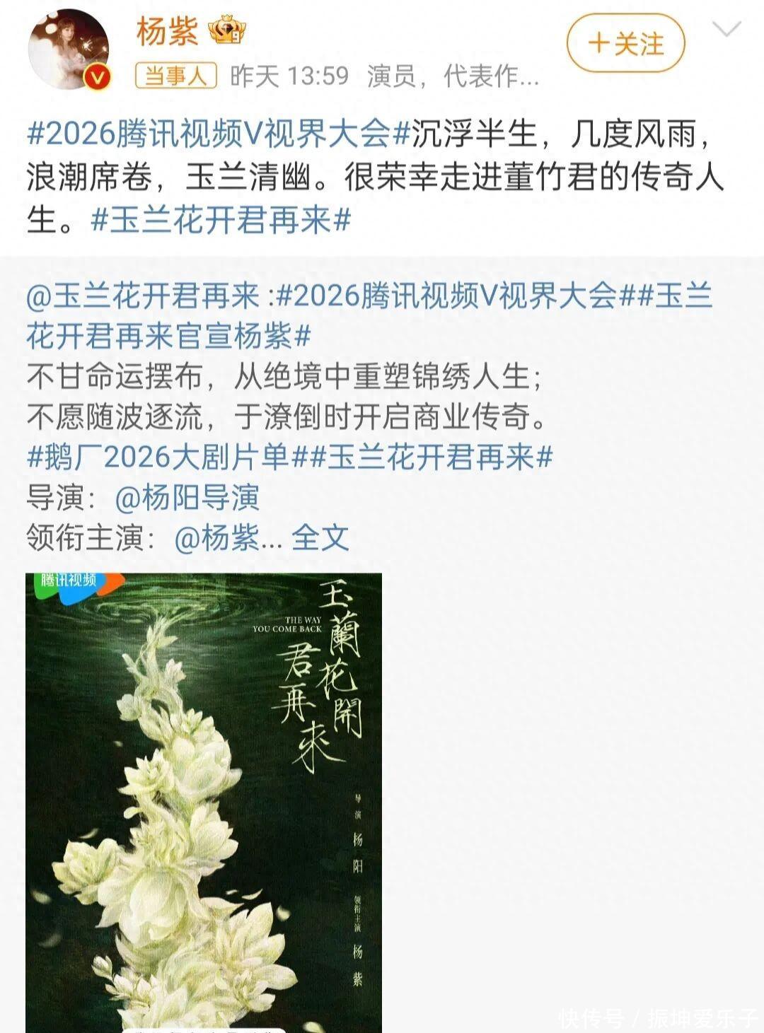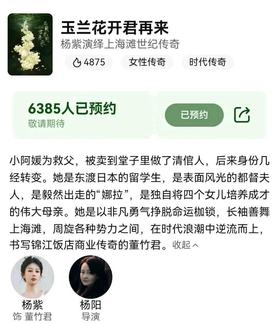 杨紫新剧正式官宣,独挑大梁演董竹君,下一个白玉兰“视后”! 鹅厂2026大剧片单一公布,杨紫演《玉兰花开君再来》的事儿就实锤了,剧方单独官宣她当大女主,网上立马就热闹起来。后来杨紫自己也回应了,说“很荣幸走进董竹君的传奇人生”,这话听着就挺有分量的。 这剧可不是普通民国剧哦,讲的是上海锦江饭店创始人董竹君的真事儿,从去日本读书、婚姻出问题,到带着女儿创业、在乱世里挣扎,情节又多又复杂,时间跨度还大,对杨紫来说确实是个挑战。不过好多观众都觉得她能行,毕竟她之前演过民国剧《战长沙》嘛。
